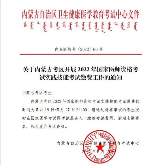 内蒙古考区2022年医师资格实践技能考试缴费时间为5月19日—27日24:00,请通过资格审核的考生登录国家医学考试网考生服务入口缴纳考试费用。逾期未缴费将被视为放弃考试。